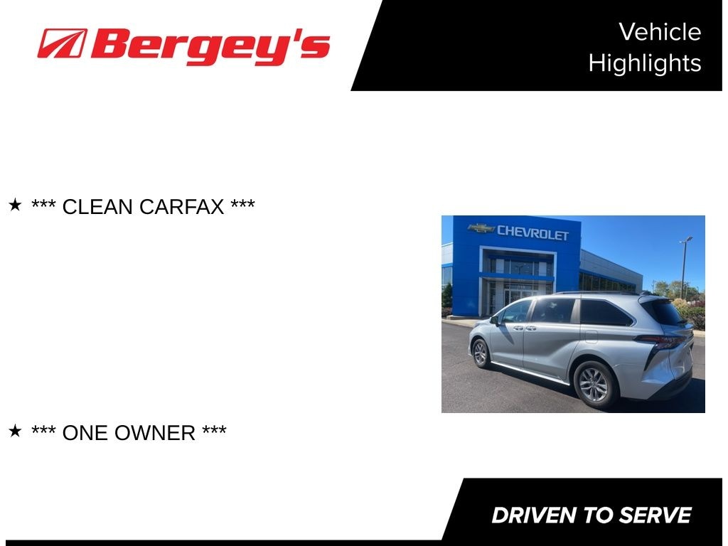 Get ready to hit the roads around Colmar, Doylestown and Sellersville in style with the 2024 Toyota Sienna XLE, available now at Bergeys Chevrolet in Colmar, PA! This smart family friendly minivan combines a hybrid powertrain yielding up to 36MPG combined with seating for seven and up to 3,500lbs towing capacity when properly equipped. Inside, you'll find premium features like heated front seats, a 9inch infotainment touchscreen, Toyota Safety Sense suite of driver assists, and the flexibility of third row seating plus big cargo space behind it.