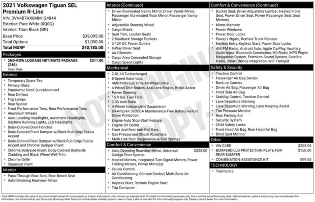 Pure White 2021 Volkswagen Tiguan 2.0T SEL Premium R-Line AWD 8-Speed Automatic with Tiptronic 2.0L TSI DOHC AWD.