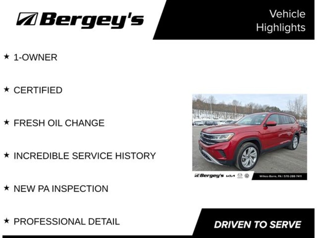 Certified. Aurora Red Metallic 2022 Volkswagen Atlas 3.6L V6 SE w/Technology AWD 8-Speed Automatic with Tiptronic 3.6L VR6 1-OWNER, CERTIFIED, FRESH OIL CHANGE, INCREDIBLE SERVICE HISTORY, NEW PA INSPECTION, PROFESSIONAL DETAIL.