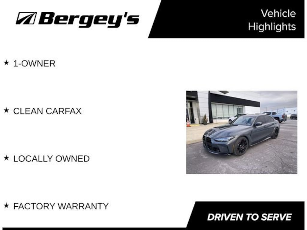 Experience the pinnacle of performance and luxury with this exceptional 2023 BMW M3 Competition. This stunning vehicle is a true testament to the brand's commitment to engineering excellence, offering a thrilling driving experience that will captivate your senses.Boasting an impressive array of features, this M3 Competition is the embodiment of power and sophistication. Key highlights include:- 1-Owner, Clean CARFAX, Locally Owned- Factory Warranty- M Carbon Exterior Package- M Driver's Package- Individual Dravit Grey Metallic Exterior- Executive Package with Remote Engine Start, Power Tailgate, BMW Head Up Display, and Heated Steering Wheel- ICON Adaptive LED Headlights with Laserlight- Carbon Fiber Trim- M Drive Professional- Parking Assistance Package with Parking Assistant Plus- Front Ventilated Seats- M Shadowline Lights- Wireless Device Charging- Drive RecorderPowered by a potent 3.0L I6 Turbocharged engine that delivers an exhilarating 503 horsepower, this M3 Competition is engineered to thrill. The 8-Speed Automatic Steptronic transmission and xDrive all-wheel-drive system provide seamless power delivery and exceptional handling, allowing you to conquer the road with confidence.Slip behind the wheel and experience the unparalleled craftsmanship that defines the BMW M3 Competition. The luxurious interior, adorned with premium materials and advanced technology, creates an environment that is both driver-focused and exceptionally comfortable. From the supportive M Sport seats to the intuitive BMW Curved Display, every detail has been meticulously designed to enhance your driving experience.Whether you're seeking a high-performance daily driver or a thrilling weekend companion, this 2023 BMW M3 Competition is the ultimate choice. With its striking appearance, uncompromising performance, and exceptional features, this vehicle is sure to captivate and impress. We invite you to schedule a test drive and discover the true essence of the BMW M3 Competition for yourself.