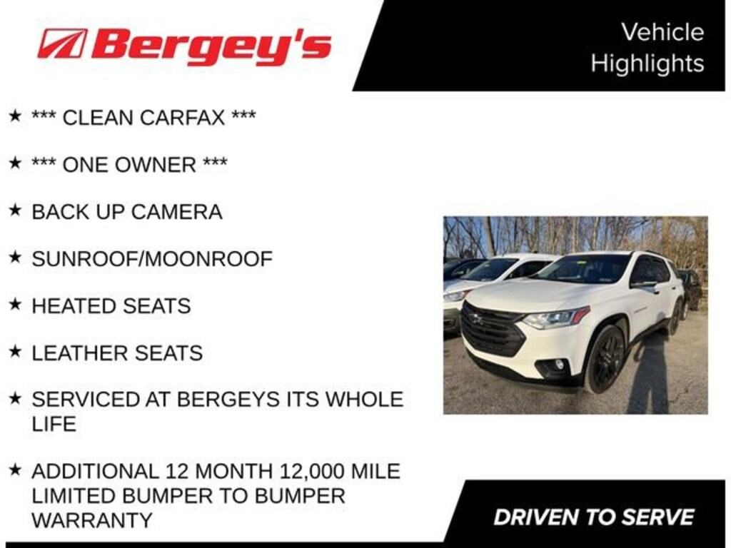 Recent Arrival! *** CLEAN CARFAX ***, *** ONE OWNER ***, BACK UP CAMERA, SUNROOF/MOONROOF, HEATED SEATS, LEATHER SEATS, SERVICED AT BERGEYS ITS WHOLE LIFE, ADDITIONAL 12 MONTH 12,000 MILE LIMITED BUMPER TO BUMPER WARRANTY, AWD. Certified. Certification Program Details: *12-Month/12,000-Mile Bumper-to-Bumper Limited Warranty*, whichever comes first, in addition to any remaining original factory Bumper-to-Bumper warranty. See participating dealer and warranty booklet for limited warranty eligibility and coverage details, including limitations and exclusions. *Except for non-GM vehicles in the State of California, where coverage will be provided by a vehicle service contract. Odometer is 24476 miles below market average!Awards:* 2021 IIHS Top Safety Pick with optional front crash prevention and specific headlights2021 Summit White Chevrolet Traverse AWD 3.6L V6 SIDI VVT 9-Speed Automatic