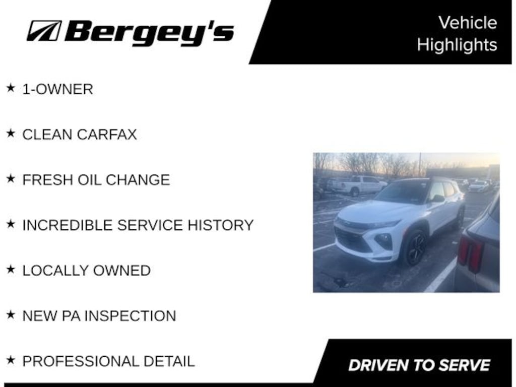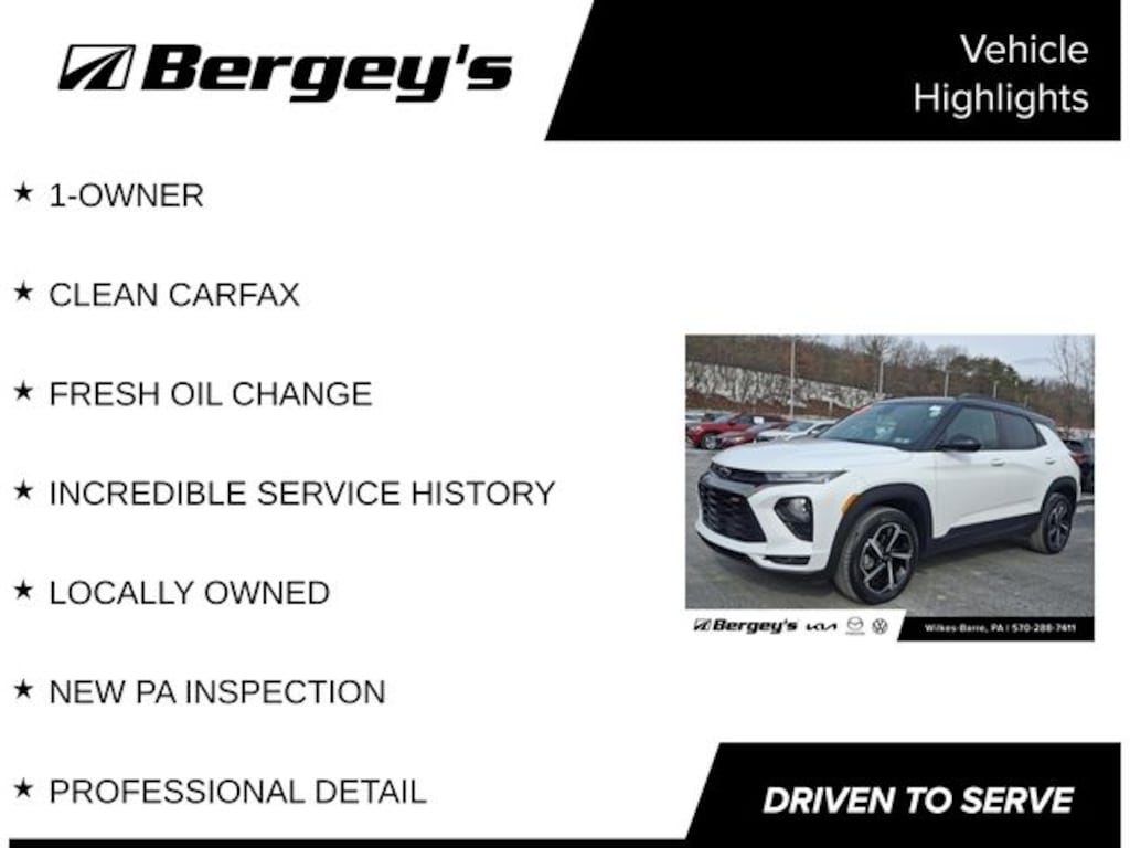 Summit White 2023 Chevrolet TrailBlazer RS AWD 9-Speed Automatic 1.3L Ecotec Turbo DOHC SIDI w/VVT 1-OWNER, CLEAN CARFAX, FRESH OIL CHANGE, INCREDIBLE SERVICE HISTORY, LOCALLY OWNED, NEW PA INSPECTION, PROFESSIONAL DETAIL.