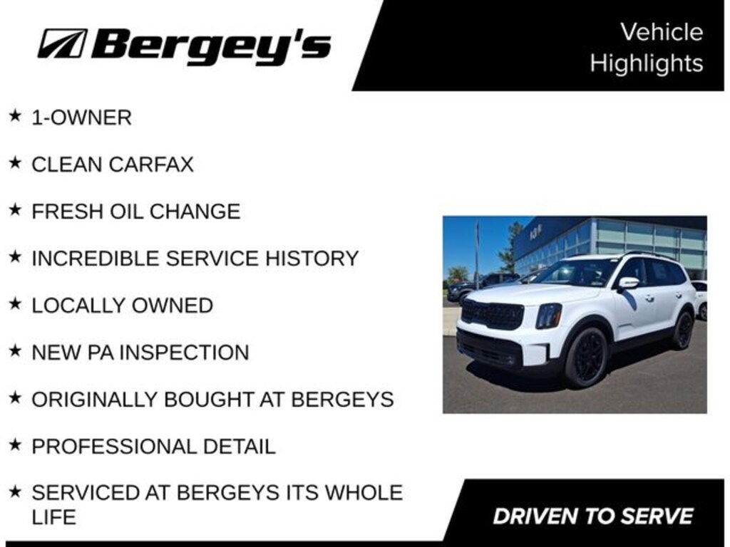 Certified. Glacial White Pearl 2025 Kia Telluride SX X-Line AWD 8-Speed Automatic 3.8L V6 DOHC 1-OWNER, CLEAN CARFAX, FRESH OIL CHANGE, INCREDIBLE SERVICE HISTORY, LOCALLY OWNED, NEW PA INSPECTION, ORIGINALLY BOUGHT AT BERGEYS, PROFESSIONAL DETAIL, SERVICED AT BERGEYS ITS WHOLE LIFE.