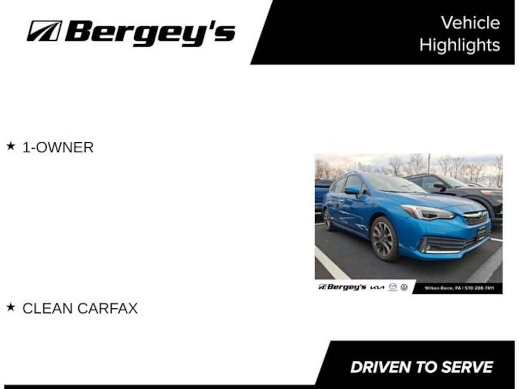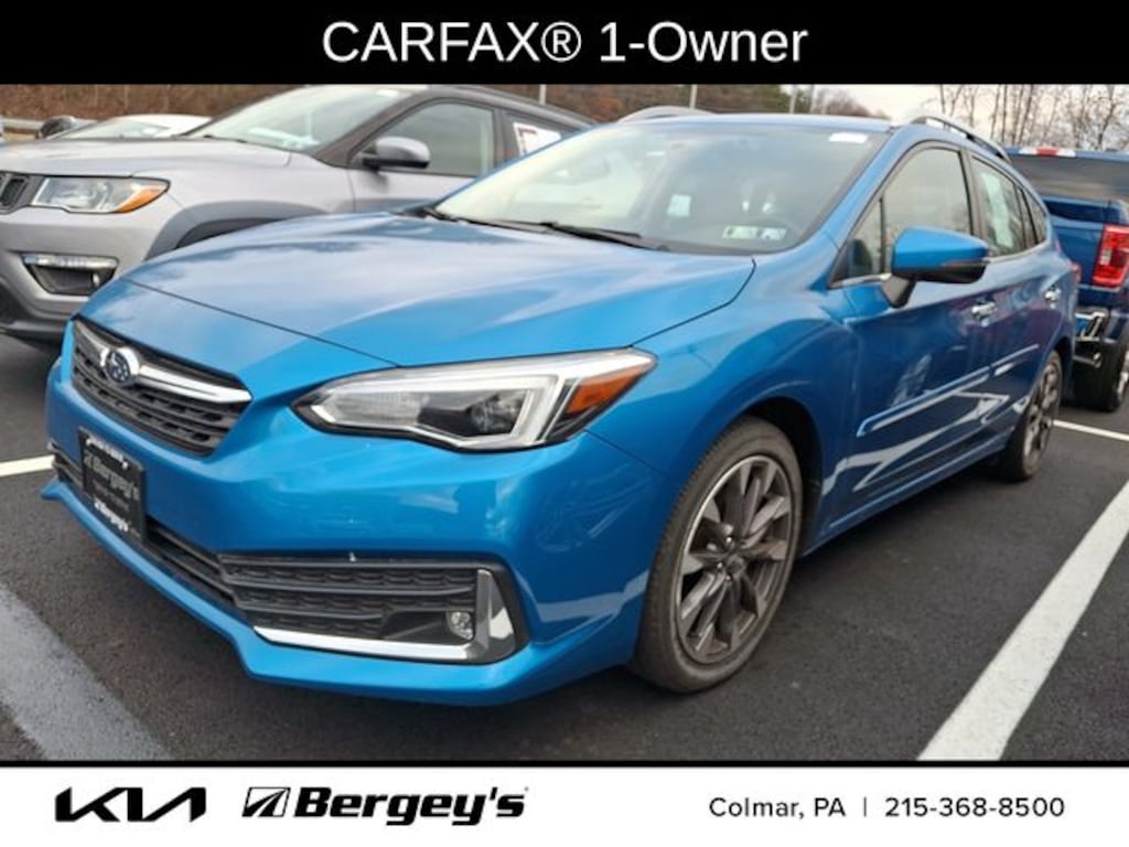 Ocean Blue Pearl 2022 Subaru Impreza Limited AWD CVT Lineartronic 2.0L DOHC 4-Wheel Disc Brakes, 6 Speakers, ABS brakes, Air Conditioning, Alloy wheels, AM/FM radio: SiriusXM, Anti-whiplash front head restraints, Auto High-beam Headlights, Automatic temperature control, Brake assist, Bumpers: body-color, CD player, Delay-off headlights, Driver door bin, Driver vanity mirror, Dual front impact airbags, Dual front side impact airbags, Electronic Stability Control, Emergency communication system, Exterior Parking Camera Rear, Four wheel independent suspension, Front anti-roll bar, Front Bucket Seats, Front Center Armrest, Front fog lights, Front reading lights, Fully automatic headlights, Heated door mirrors, Heated Front Bucket Seats, Heated front seats, Illuminated entry, Knee airbag, Low tire pressure warning, Occupant sensing airbag, Outside temperature display, Overhead airbag, Overhead console, Panic alarm, Passenger door bin, Passenger vanity mirror, Perforated Leather-Trimmed Upholstery, Power door mirrors, Power driver seat, Power steering, Power windows, Radio data system, Radio: Subaru STARLINK 8.0" Multimedia Plus System, Rear anti-roll bar, Rear seat center armrest, Rear window defroster, Rear window wiper, Remote keyless entry, Security system, Speed control, Speed-sensing steering, Split folding rear seat, Spoiler, Standard Model, STARLINK/Apple CarPlay/Android Auto, Steering wheel mounted audio controls, Tachometer, Telescoping steering wheel, Tilt steering wheel, Traction control, Trip computer, Turn signal indicator mirrors, Variably intermittent wipers, Wheels: 17" x 7.0" Machine Finish J Aluminum-Alloy, 1-OWNER, CLEAN CARFAX.