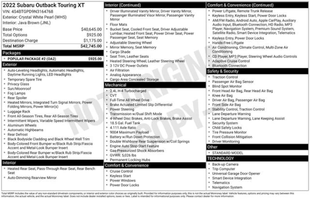 Crystal White Pearl 2022 Subaru Outback Touring XT AWD CVT Lineartronic 2.4L DOHC