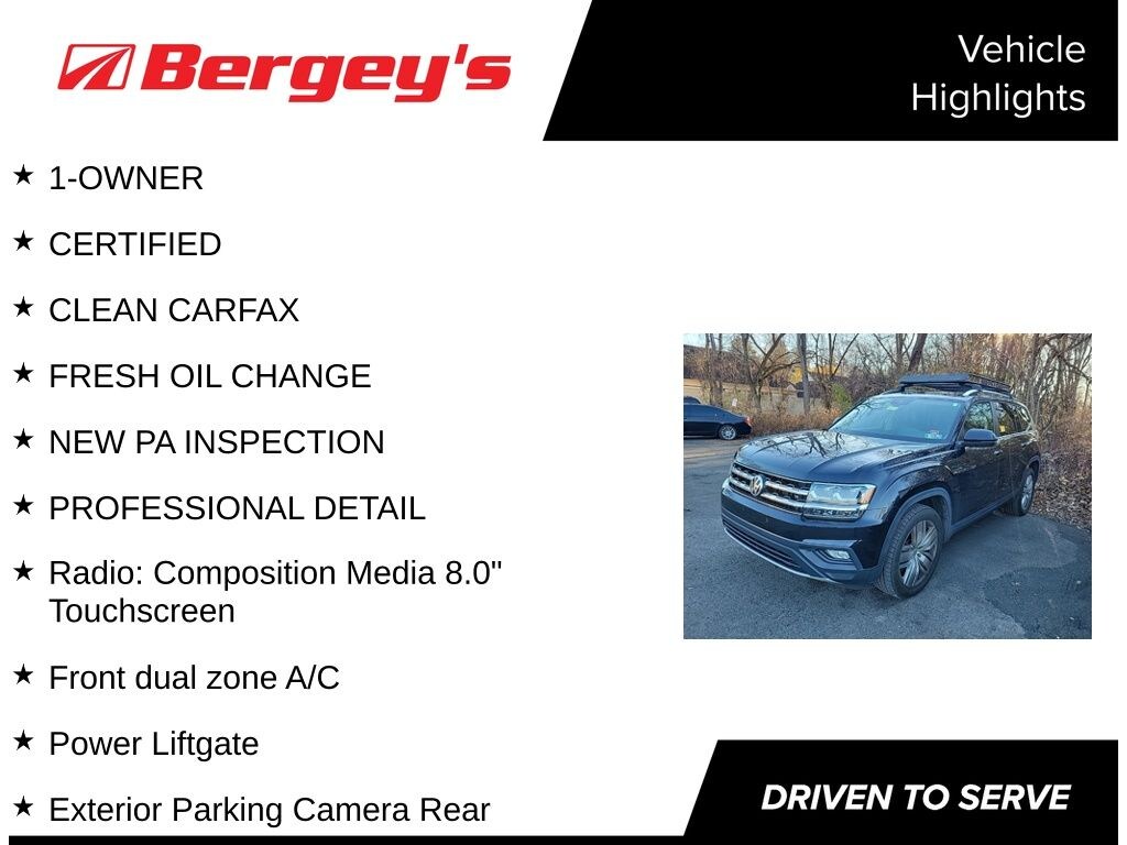 Clean CARFAX. CARFAX One-Owner. Certified. 2019 Volkswagen Atlas 3.6L V6 SE w/Technology AWD 8-Speed Automatic with Tiptronic 3.6L VR6 1-OWNER, CERTIFIED, CLEAN CARFAX, FRESH OIL CHANGE, NEW PA INSPECTION, PROFESSIONAL DETAIL, Atlas 3.6L V6 SE w/Technology, 3.6L VR6, 8-Speed Automatic with Tiptronic, AWD, 18" 5-Spoke Wheels, Alloy wheels, Exterior Parking Camera Rear, Front dual zone A/C, Heated Comfort Front Bucket Seats, Power Liftgate, Radio: Composition Media 8.0" Touchscreen.