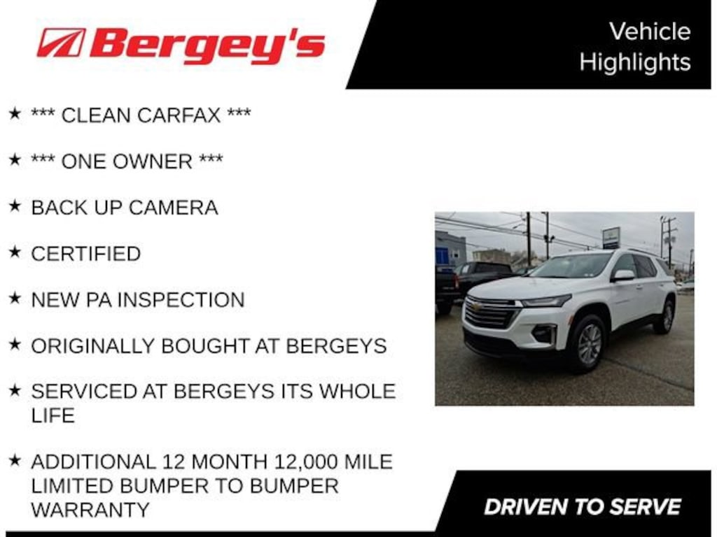 *** CLEAN CARFAX ***, *** ONE OWNER ***, BACK UP CAMERA, CERTIFIED, ORIGINALLY BOUGHT AT BERGEYS, SERVICED AT BERGEYS ITS WHOLE LIFE. Certified. Certification Program Details: *6-Month/6,000-Mile Bumper-to-Bumper Limited Warranty*, whichever comes first, in addition to any remaining original factory Bumper-to-Bumper warranty. See participating dealer and warranty booklet for limited warranty eligibility and coverage details, including limitations and exclusions. *Except for non-GM vehicles in the State of California, where coverage will be provided by a vehicle service contract. Odometer is 12261 miles below market average!18/27 City/Highway MPG2023 Iridescent Pearl Tricoat Chevrolet Traverse FWD 3.6L V6 SIDI VVT 9-Speed Automatic